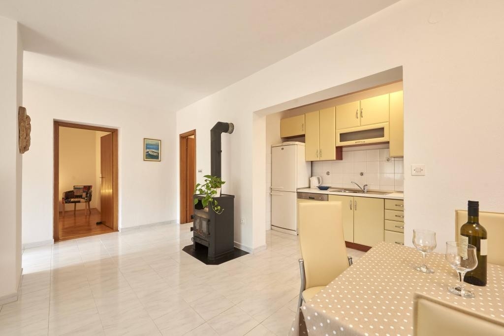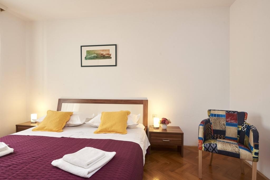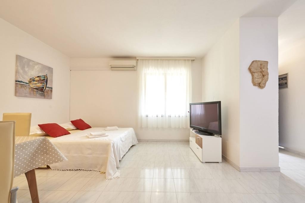 Apartment can accommodate 4 guests. Beds are situated in 1 sleeping rooms, but also in the living room, within 45m2. Guests can use a private terrace to enjoy the warm summer evenings. Food can be prepared using barbecue which is shared with other guests too. INCLUDED IN THE PRICE: tourist tax, final cleaning, air-conditioning, parking, internet, laundry, baby cot, iron, ironing board, hairdryer, sunchairs. The availability of additional services for your chosen dates of stay, as well as their prices (if none are listed) must be checked ahead of time. Any additional services not shown in the price calculation are payable directly to the property owner and only if used by the visitor.