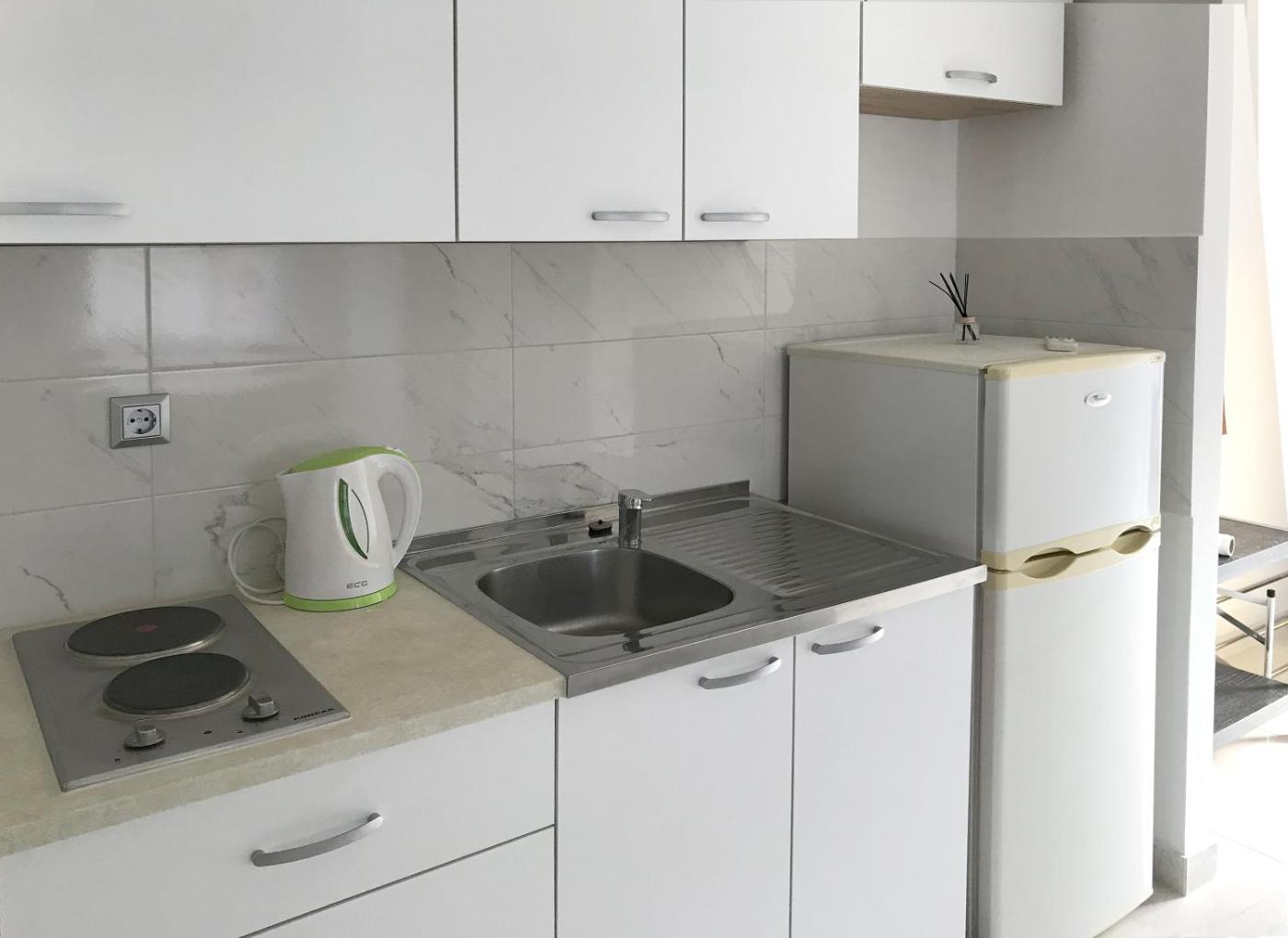 Two-Bedroom Apartment. Featuring a private entrance, this air-conditioned apartment comprises 2 bedrooms and 1 bathroom with a walk-in shower. Guests can make meals in the kitchenette that comes with a stovetop, a refrigerator, kitchenware and an electric kettle. Boasting a terrace with sea views, this apartment also provides a seating area and a flat-screen TV. The unit offers 3 beds.