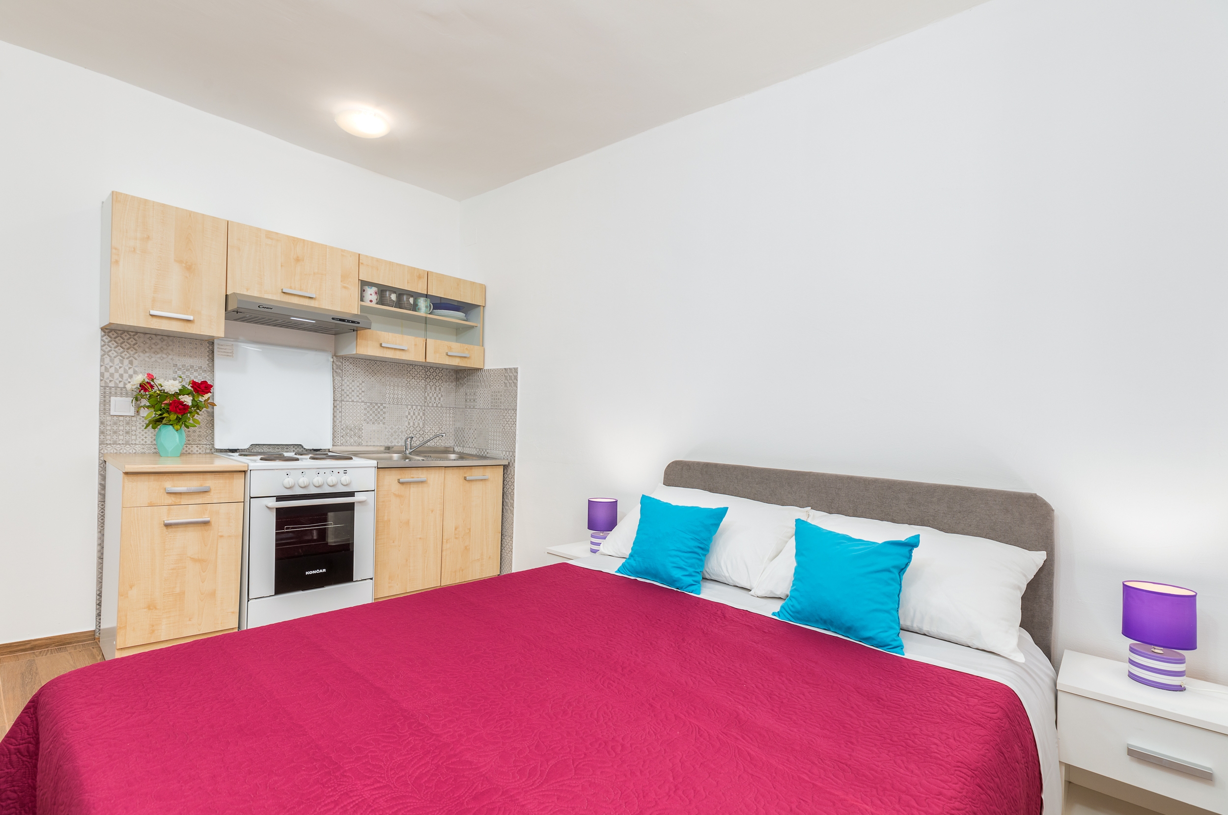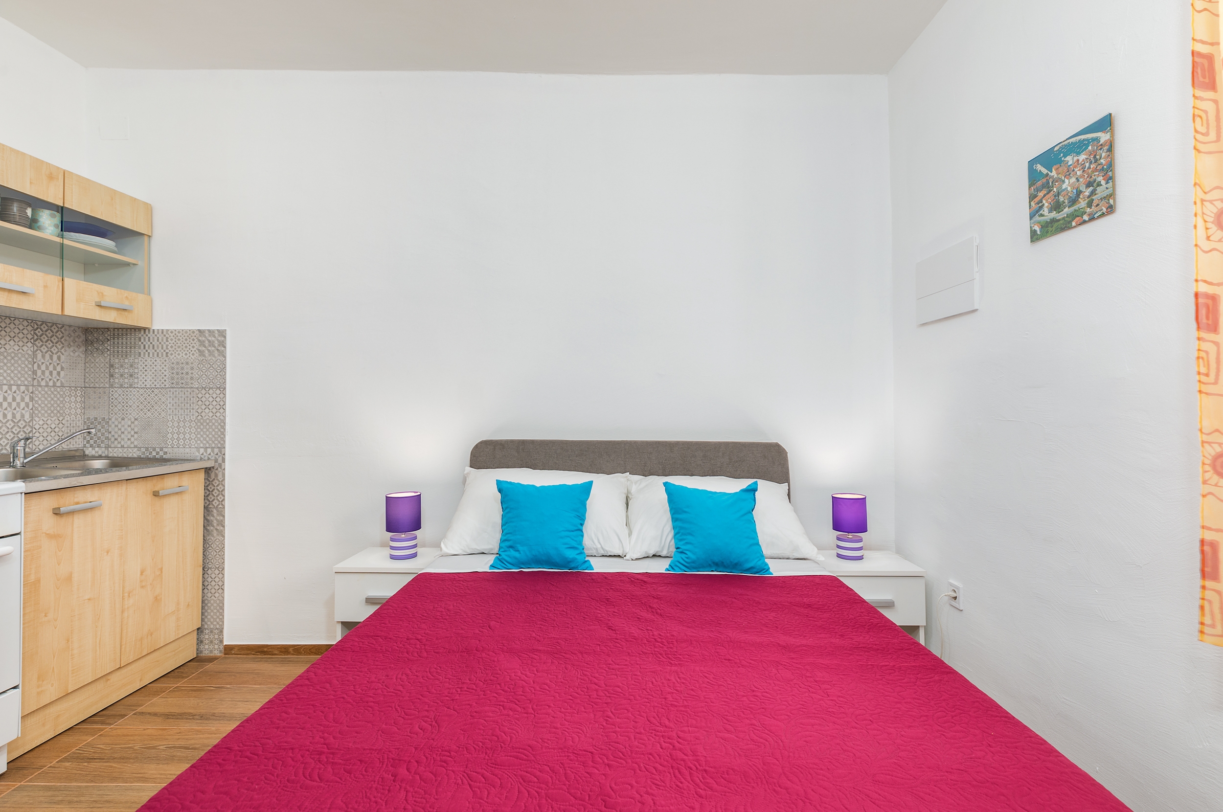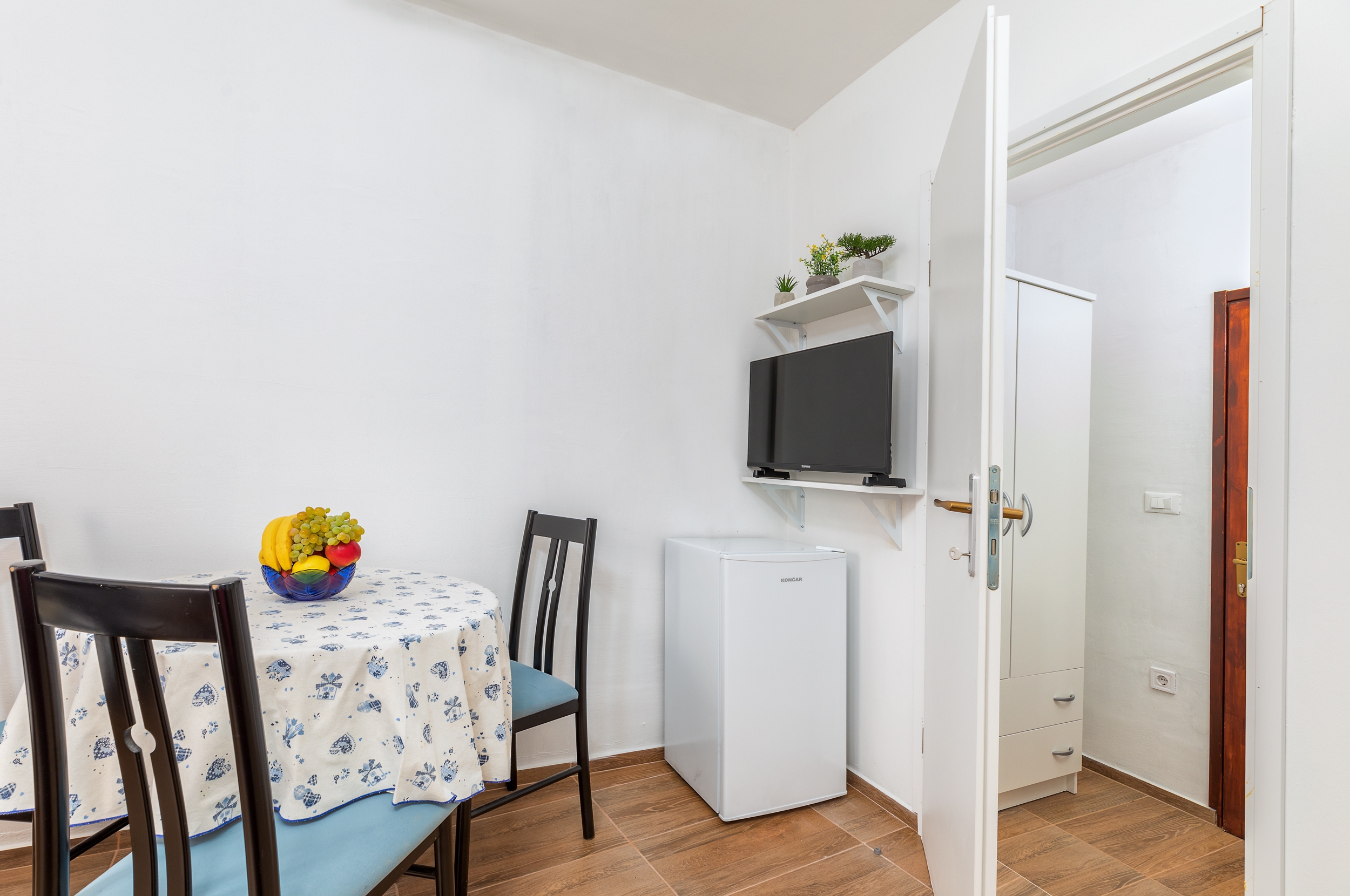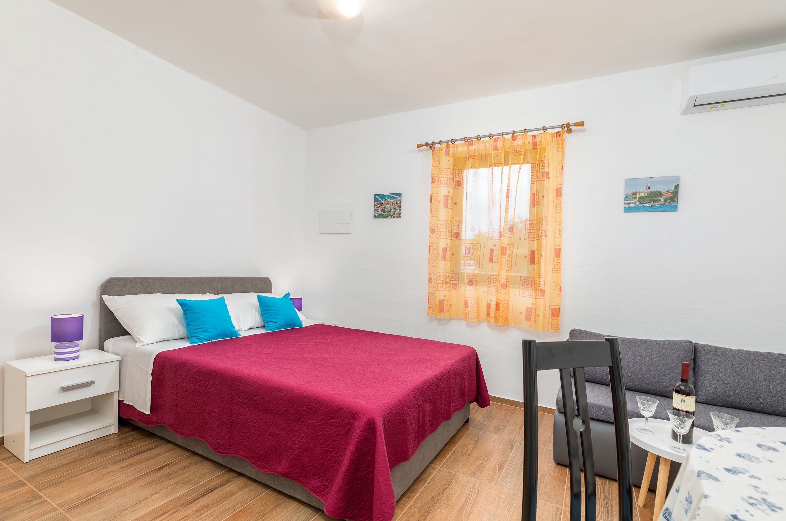 Studio flat can accommodate 3 guests. Beds are situated in 1 sleeping rooms, but also in the dining room, within 24m2. Food can be prepared using barbecue which is shared with other guests too. There is no balcony or terrace in the reserved accommodation unit. INCLUDED IN THE PRICE: tourist tax, final cleaning, air-conditioning, parking, internet. The availability of additional services for your chosen dates of stay, as well as their prices (if none are listed) must be checked ahead of time. Any additional services not shown in the price calculation are payable directly to the property owner and only if used by the visitor.