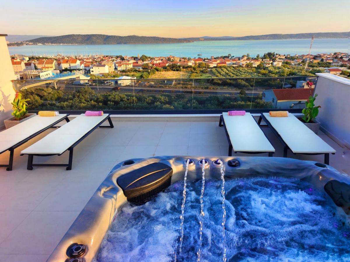 The spacious apartment with a terrace and sea views features 2 bedrooms, a living room, a flat-screen TV, an equipped kitchen, and 2 bathrooms with a hot tub.