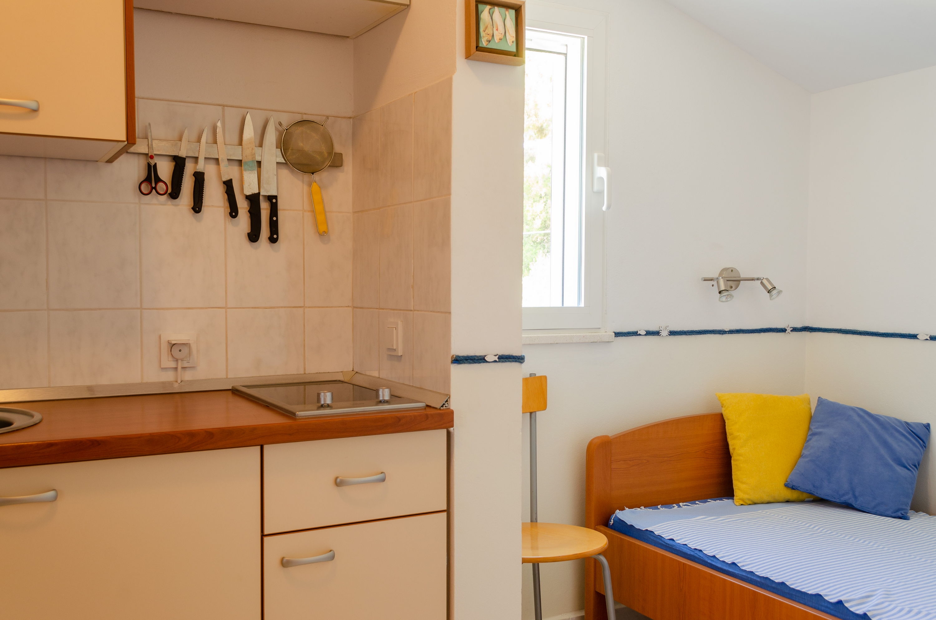 Studio flat can accommodate 2 guests. Beds are situated in 1 sleeping rooms, within 25m2. Guests can use a private terrace to enjoy the warm summer evenings. The studio offers the sea view. Food can be prepared using barbecue which is shared with other guests too. This accommodation unit welcomes pets at an additional charge. INCLUDED IN THE PRICE: tourist tax, final cleaning, air-conditioning, parking, internet, hairdryer. OPTIONAL ADDITIONAL COSTS: boat mooring (€10.00 per night), pets (€5.00 per night). The availability of additional services for your chosen dates of stay, as well as their prices (if none are listed) must be checked ahead of time. Any additional services not shown in the price calculation are payable directly to the property owner and only if used by the visitor. Discounts to the base price: free day 14=13 (for reservations of 14 or more days you get one free day for the stay until 31122026).