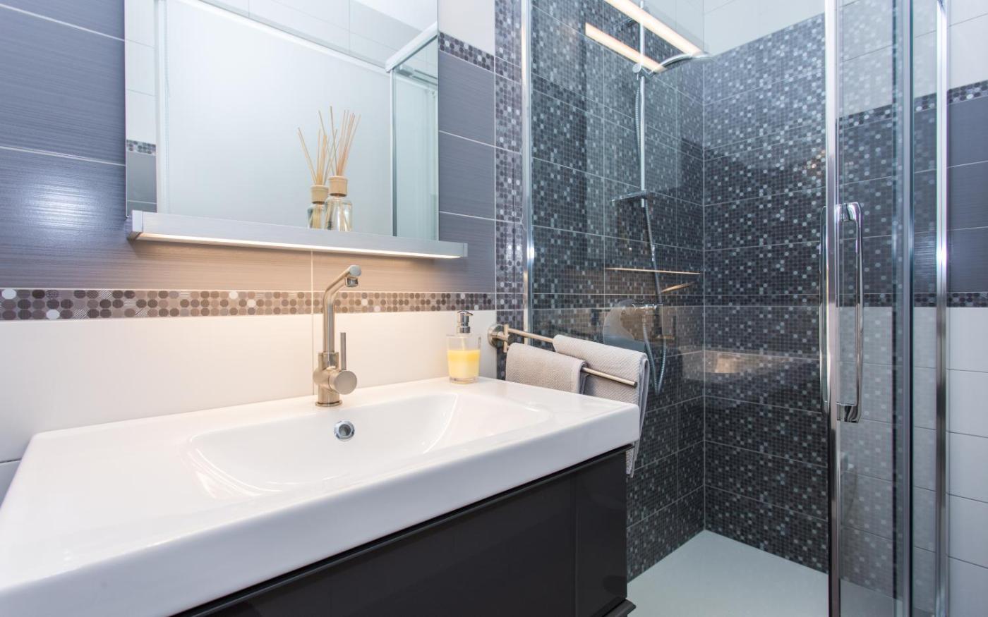 One-Bedroom Apartment. Boasting a private entrance, this air-conditioned apartment comes with 1 living room, 1 separate bedroom and 1 bathroom with a walk-in shower and a hairdryer. Guests can make meals in the kitchen that features a stovetop, a refrigerator, kitchenware and an oven. Featuring a terrace with sea views, this apartment also features soundproof walls and a flat-screen TV with cable channels. The unit has 2 beds.