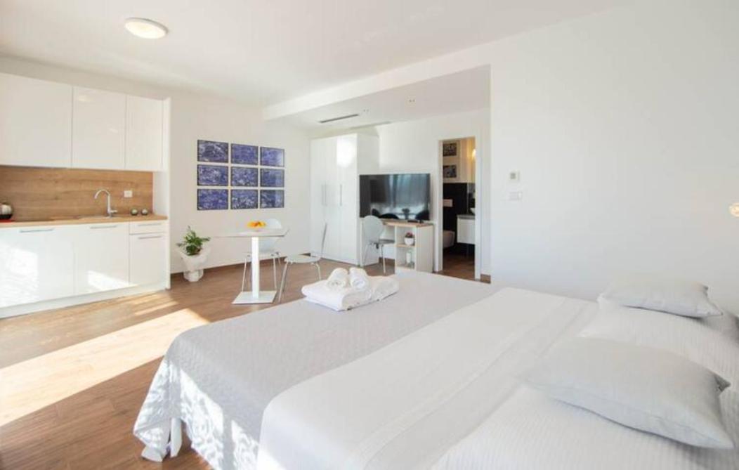 Studio Apartment. Featuring a private entrance, this air-conditioned apartment comprises 1 living room, 1 separate bedroom and 1 bathroom with a walk-in shower and a hairdryer. Meals can be prepared in the well-fitted kitchenette, which comes with a stovetop, a refrigerator, kitchenware and a tea and coffee maker. Boasting a terrace with sea views, this apartment also provides a washing machine and a flat-screen TV. The unit offers 1 bed. ;
