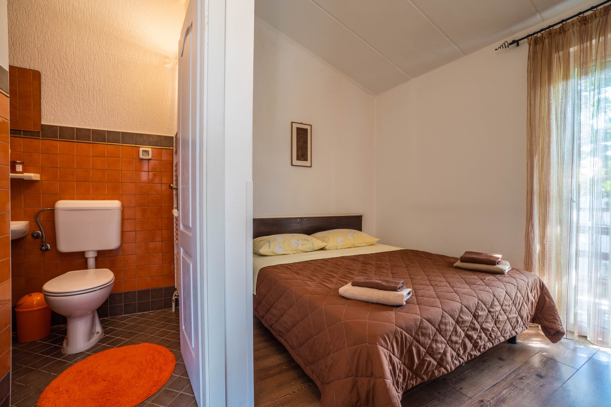 Apartment can accommodate 4 guests. Beds are situated in 1 sleeping rooms, but also in the living room, within 22m2. Guests can use a private balcony to enjoy the warm summer evenings. Food can be prepared using barbecue which is shared with other guests too. This accommodation unit welcomes pets at an additional charge. INCLUDED IN THE PRICE: tourist tax, final cleaning, air-conditioning, parking, internet, iron, ironing board, hairdryer. OBLIGATORY ADDITIONAL COSTS: short stay fee (surcharge depending on a number of booked nights: 30% - 1, 20% - 2, 10% - 3). OPTIONAL ADDITIONAL COSTS: central heating (€8.00 per night), laundry (€5.00 washing), pets (€10.00 per night). The availability of additional services for your chosen dates of stay, as well as their prices (if none are listed) must be checked ahead of time. Any additional services not shown in the price calculation are payable directly to the property owner and only if used by the visitor.