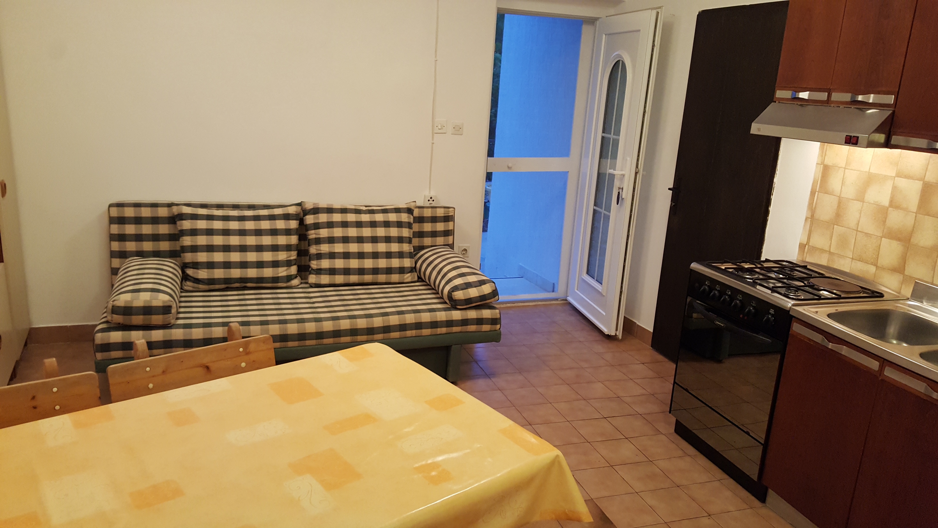 Apartment can accommodate 4 guests. Beds are situated in 1 sleeping rooms, but also in the dining room, within 38m2. Guests can use a private terrace to enjoy the warm summer evenings. Food can be prepared using barbecue which is shared with other guests too. This accommodation unit welcomes pets at an additional charge. Other guests or hosts pass through the terrace of the booked accommodation unit. INCLUDED IN THE PRICE: tourist tax, final cleaning, air-conditioning, parking, internet, hairdryer. OBLIGATORY ADDITIONAL COSTS: short stay fee (surcharge depending on a number of booked nights: 30% - 1, 20% - 2, 10% - 3). OPTIONAL ADDITIONAL COSTS: laundry (€5.00 washing), pets (€5.00 per night). The availability of additional services for your chosen dates of stay, as well as their prices (if none are listed) must be checked ahead of time. Any additional services not shown in the price calculation are payable directly to the property owner and only if used by the visitor.