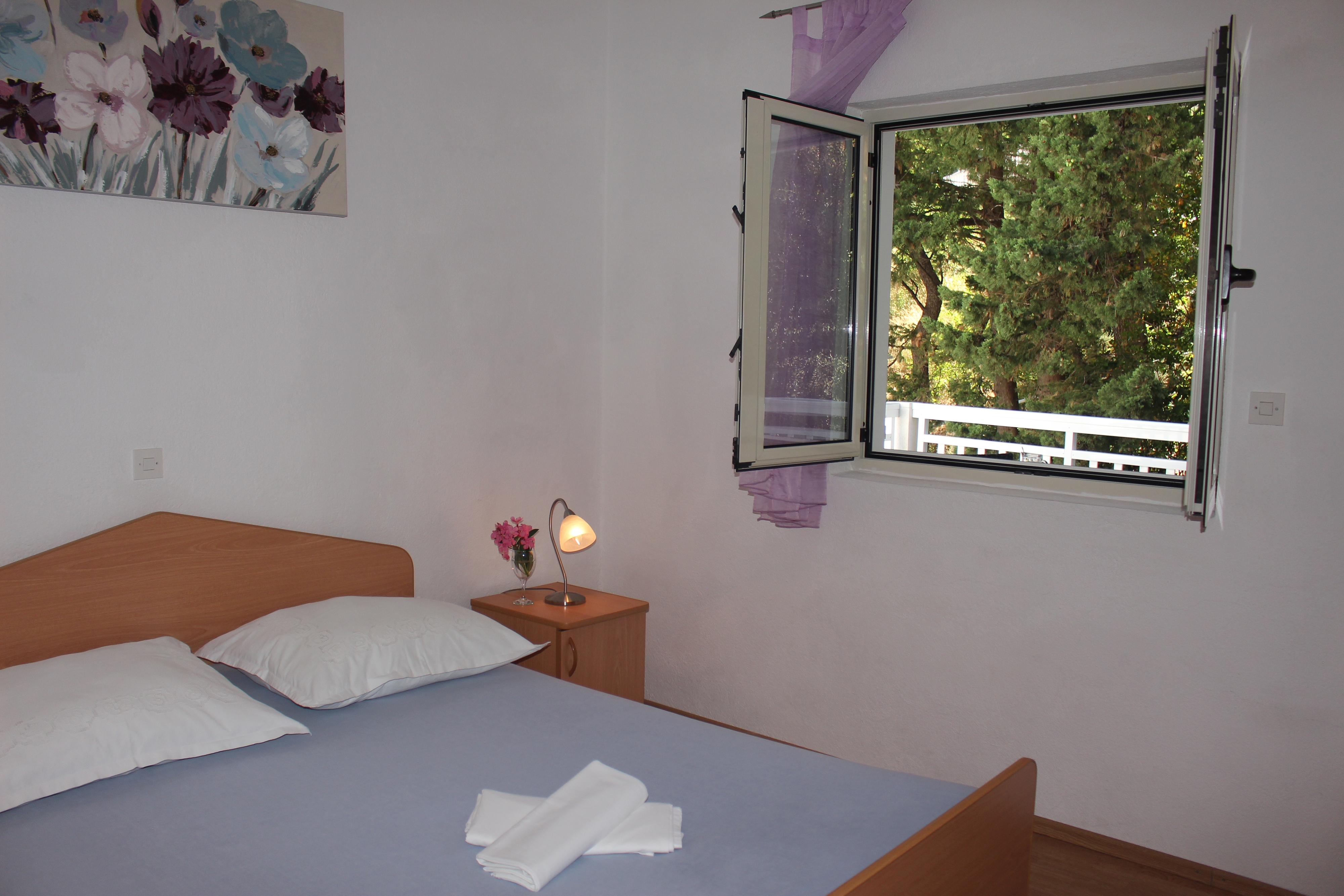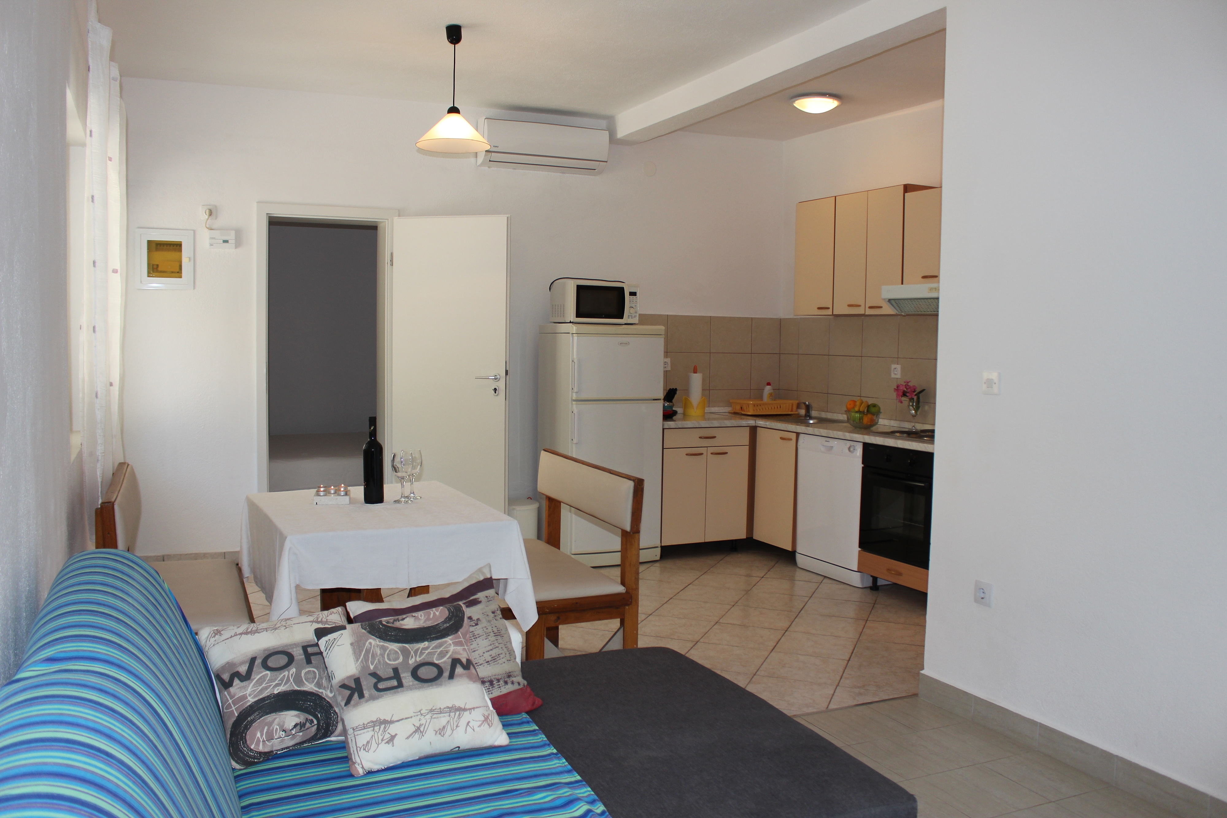 Apartment can accommodate 5 guests. Beds are situated in 2 sleeping rooms, but also in the living room, within 52m2. Guests can use a private terrace to enjoy the warm summer evenings. The apartment offers the sea view. Food can be prepared using barbecue which is shared with other guests too. This accommodation unit welcomes pets at an additional charge. INCLUDED IN THE PRICE: tourist tax, final cleaning, parking, internet, baby cot, iron, ironing board, hairdryer, portable barbecue. OBLIGATORY ADDITIONAL COSTS: short stay fee (surcharge depending on a number of booked nights: 30% - 1, 20% - 2, 10% - 3). OPTIONAL ADDITIONAL COSTS: air-conditioning (€5.00 per night), laundry (€3.00 washing), boat (€70.00 per night), boat mooring (€10.00 per night), pets (€10.00 per night). The availability of additional services for your chosen dates of stay, as well as their prices (if none are listed) must be checked ahead of time. Any additional services not shown in the price calculation are payable directly to the property owner and only if used by the visitor.