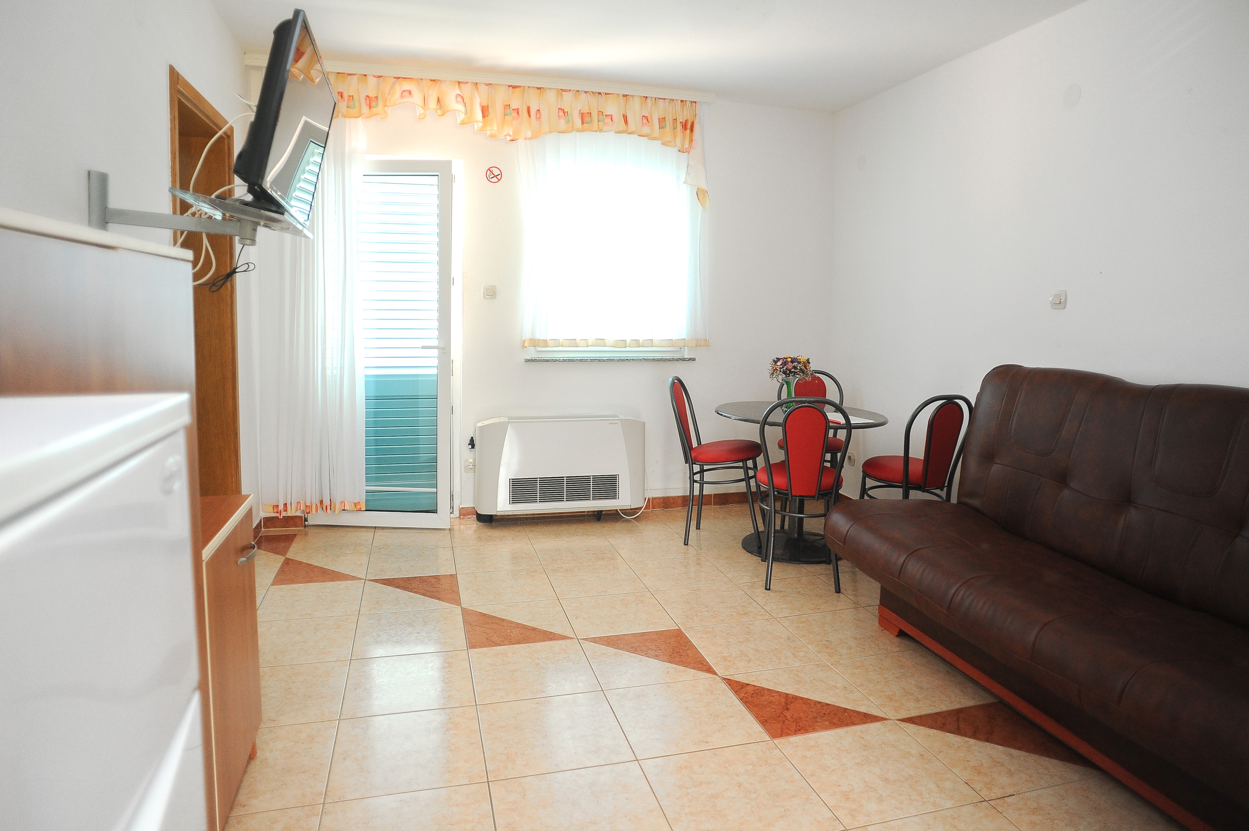 Apartment can accommodate 4 guests. Beds are situated in 1 sleeping rooms, but also in the dining room, within 32m2. Guests can use a private terrace to enjoy the warm summer evenings. The apartment offers the sea view. Shared pool is on disposal during stay. INCLUDED IN THE PRICE: final cleaning, air-conditioning, pool, parking, internet, hairdryer. OBLIGATORY ADDITIONAL COSTS: tourist tax (adults €0.93 - €1.60 nightperson, discount for children aged 12 - 17), short stay fee (surcharge depending on a number of booked nights: 30% - 1, 20% - 2, 10% - 3). OPTIONAL ADDITIONAL COSTS: breakfast (€10.00, a 50% discount for children aged 4 to 12 years, Children up to age 4 free of charge), half-board (€30.00, a 50% discount for children aged 4 to 12 years, Children up to age 4 free of charge), laundry (€20.00 washing), additional bed (€15.00 per night). The availability of additional services for your chosen dates of stay, as well as their prices (if none are listed) must be checked ahead of time. Any additional services not shown in the price calculation are payable directly to the property owner and only if used by the visitor. Discounts to the base price: free day 28=25 (for stays of 28 days or more, we give you 3 days free of charge for the stay until 31122026).