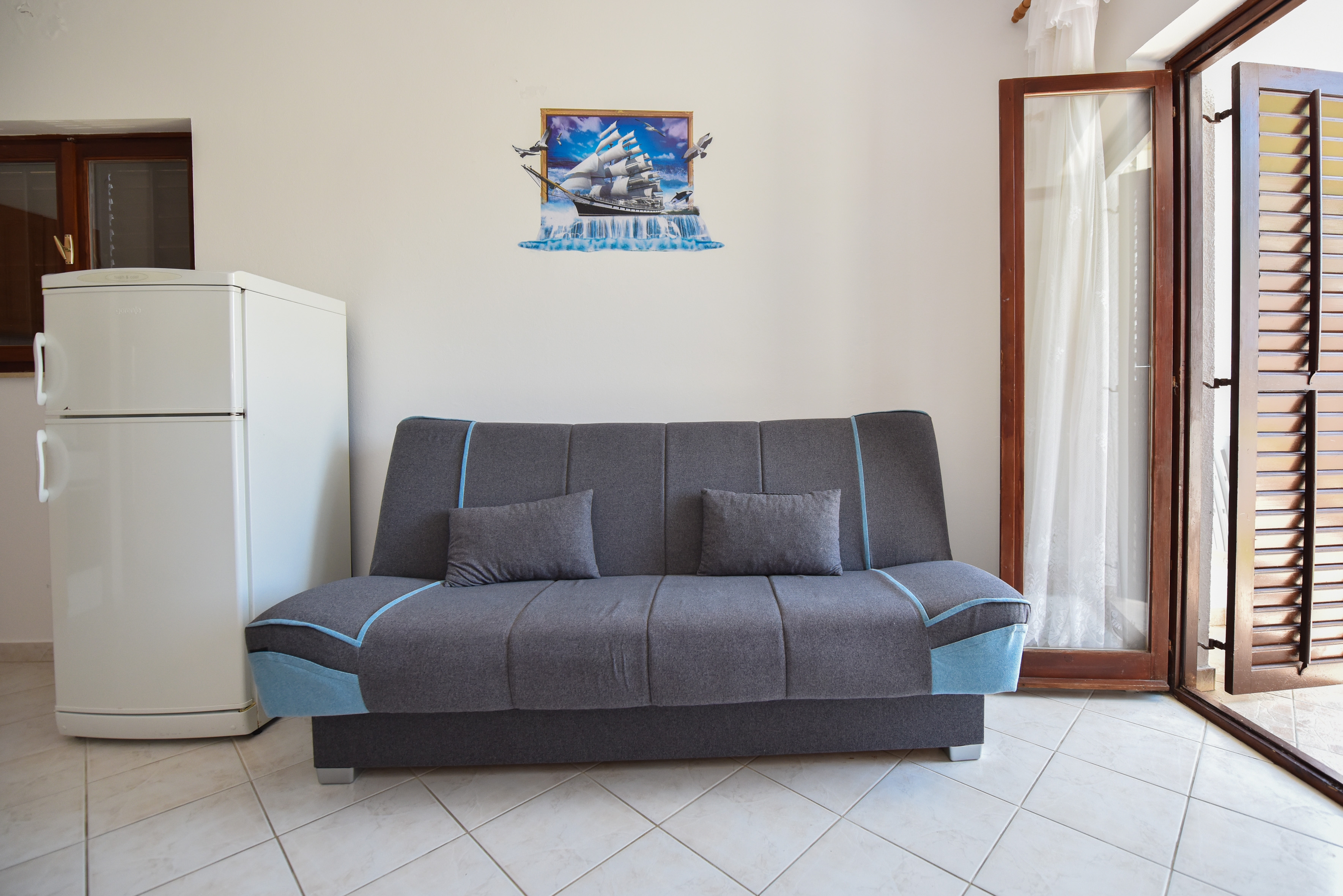 Apartment can accommodate 4 guests. Beds are situated in 1 sleeping rooms, but also in the living room, within 36m2. Guests can use a private terrace to enjoy the warm summer evenings. The apartment offers the sea view. Food can be prepared using barbecue which is shared with other guests too. This accommodation unit welcomes pets at an additional charge. INCLUDED IN THE PRICE: final cleaning, air-conditioning, parking, internet, boat mooring, iron, ironing board, hairdryer. OBLIGATORY ADDITIONAL COSTS: tourist tax (adults €0.93 - €1.60 nightperson, discount for children aged 12 - 17), short stay fee (surcharge depending on a number of booked nights: 30% - 1, 20% - 2, 10% - 3). OPTIONAL ADDITIONAL COSTS: laundry (€5.00 washing), pets (€5.00 per night), additional bed (€5.00 per night). The availability of additional services for your chosen dates of stay, as well as their prices (if none are listed) must be checked ahead of time. Any additional services not shown in the price calculation are payable directly to the property owner and only if used by the visitor.
