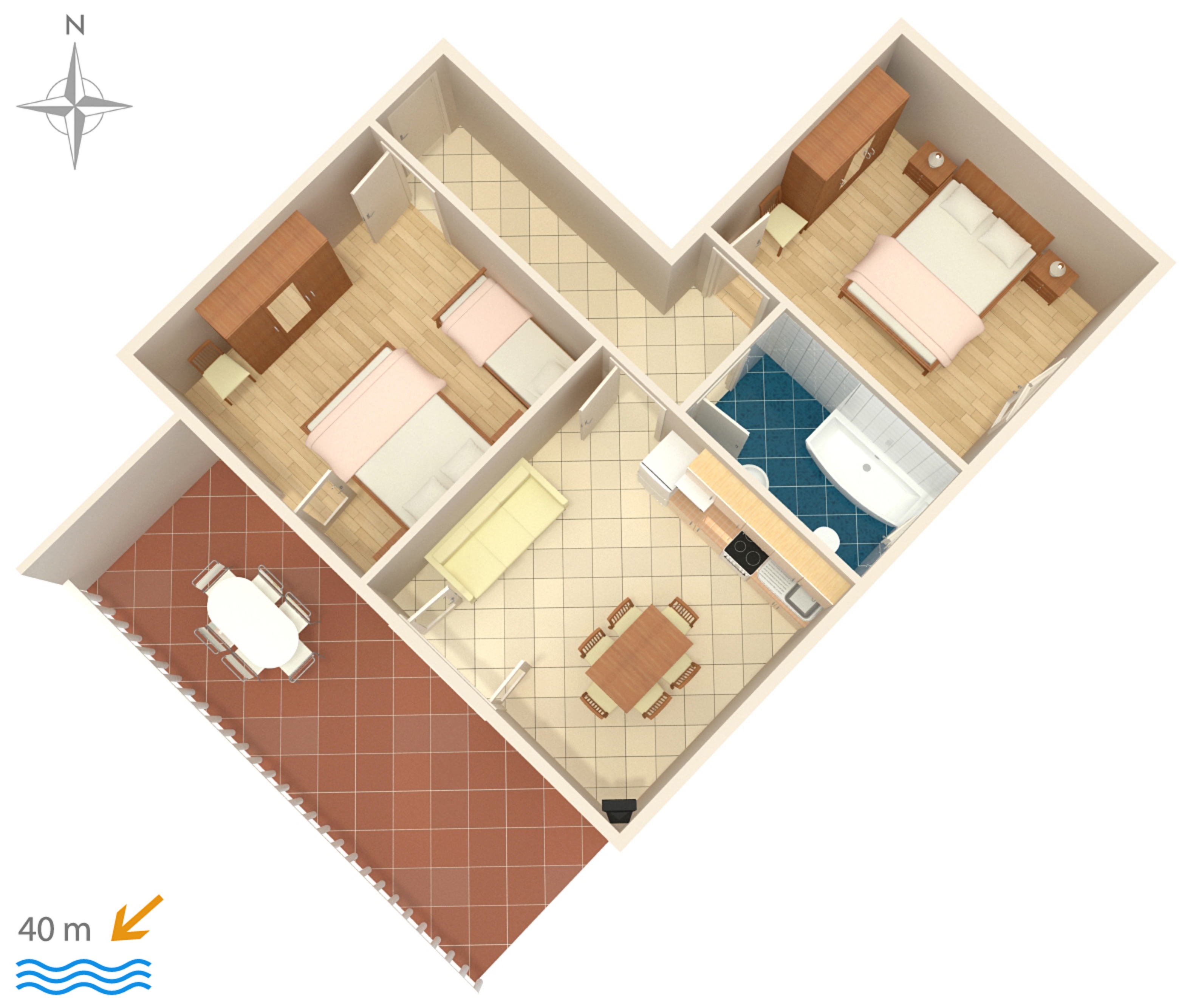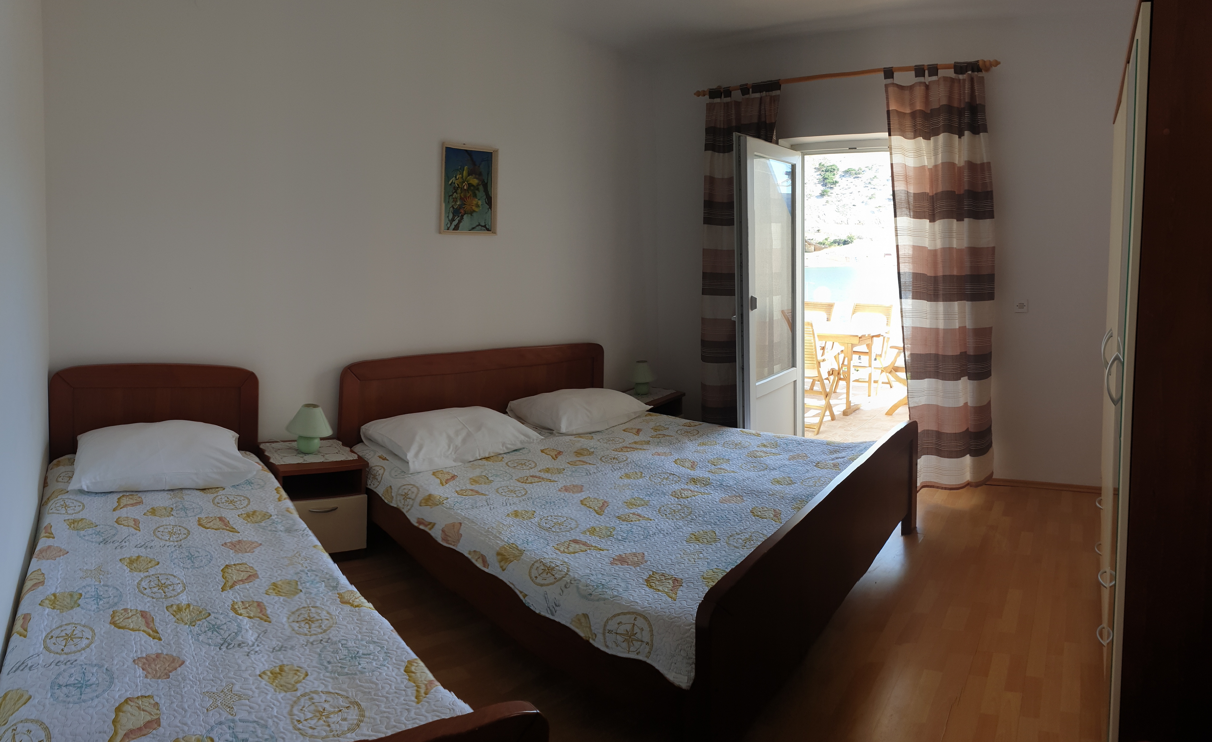 Apartment can accommodate 5 guests. Beds are situated in 2 sleeping rooms, within 51m2. Guests can use a private terrace to enjoy the warm summer evenings. The apartment offers the sea view. Food can be prepared using barbecue which is shared with other guests too. This accommodation unit welcomes pets at an additional charge. INCLUDED IN THE PRICE: tourist tax, final cleaning, air-conditioning, parking, internet, boat mooring. OBLIGATORY ADDITIONAL COSTS: short stay fee (surcharge depending on a number of booked nights: 30% - 1, 20% - 2, 10% - 3). OPTIONAL ADDITIONAL COSTS: laundry (€5.00 washing), pets (€5.00 per night). The availability of additional services for your chosen dates of stay, as well as their prices (if none are listed) must be checked ahead of time. Any additional services not shown in the price calculation are payable directly to the property owner and only if used by the visitor. Discounts to the base price: free day 28=25 (for stays of 28 days or more, we give you 3 days free of charge for the stay until 31122026).