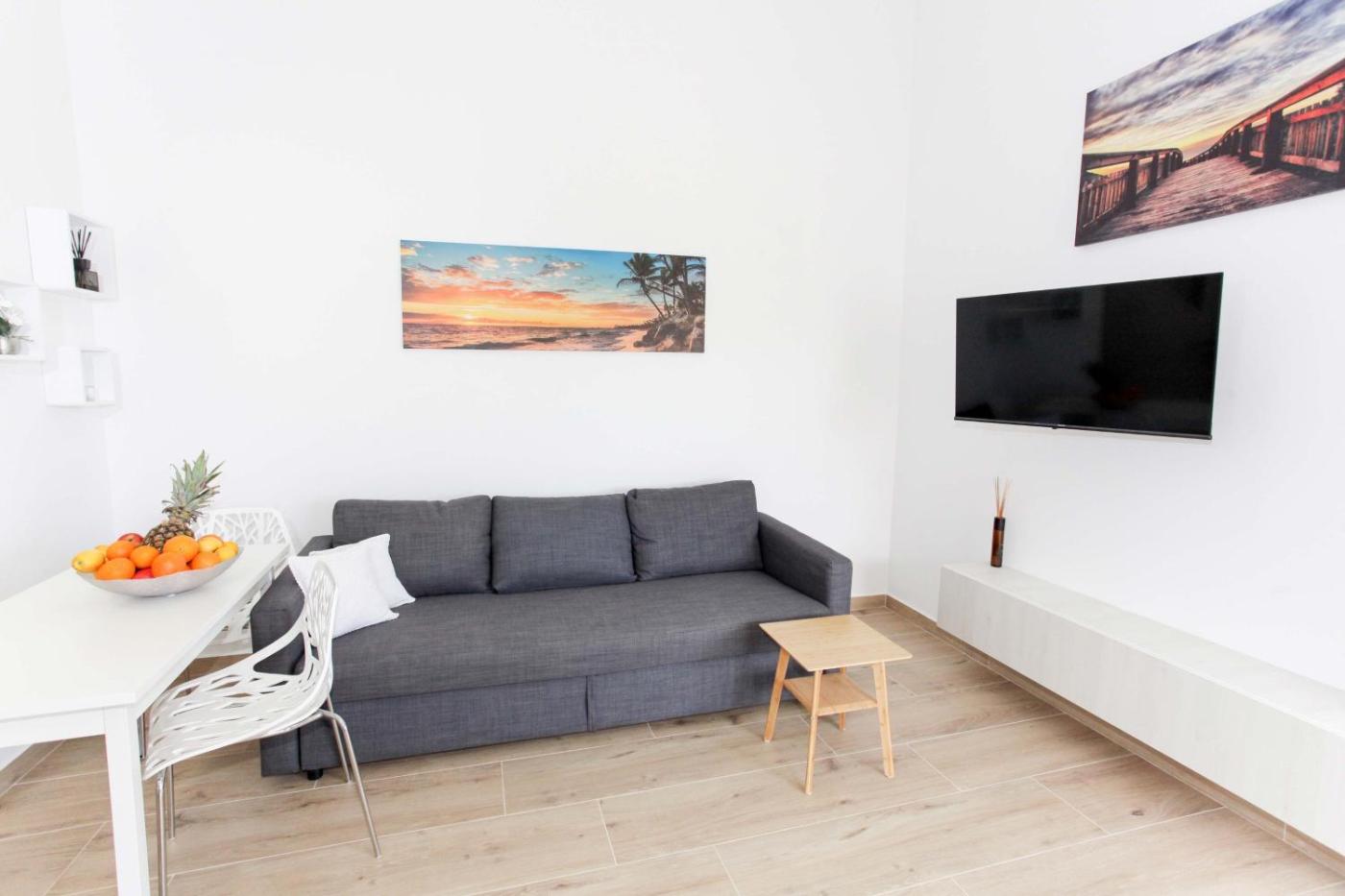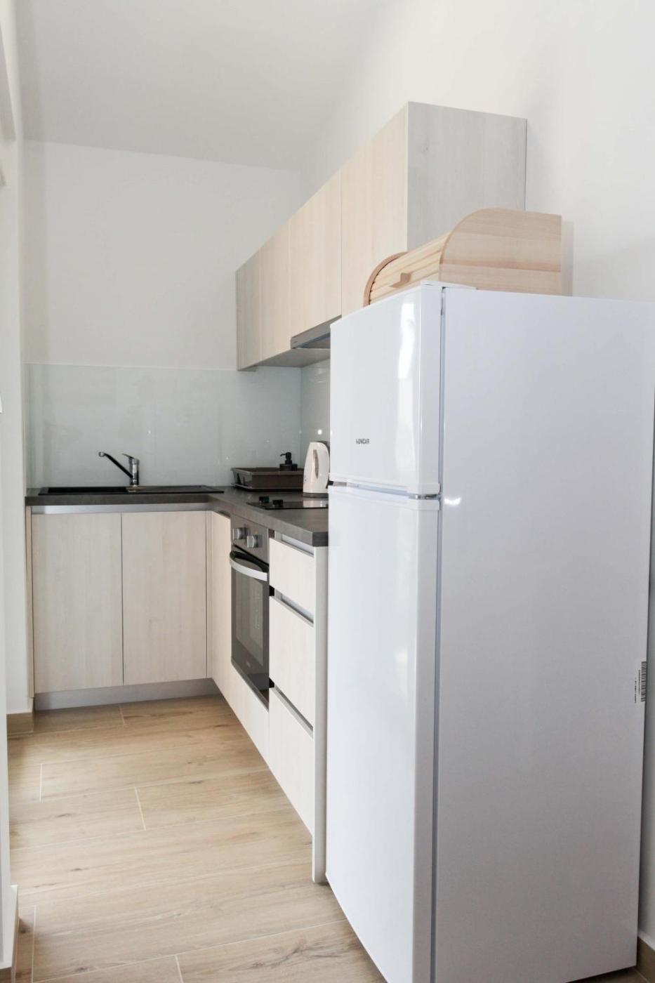 One-Bedroom Apartment. Featuring a private entrance, this air-conditioned apartment consists of 1 living room, 1 separate bedroom and 1 bathroom with a walk-in shower and a hairdryer. Guests can make meals in the kitchen that is equipped with a stovetop, a refrigerator, kitchenware and an oven. Boasting a balcony with sea views, this apartment also provides soundproof walls and a flat-screen TV. The unit offers 2 beds.