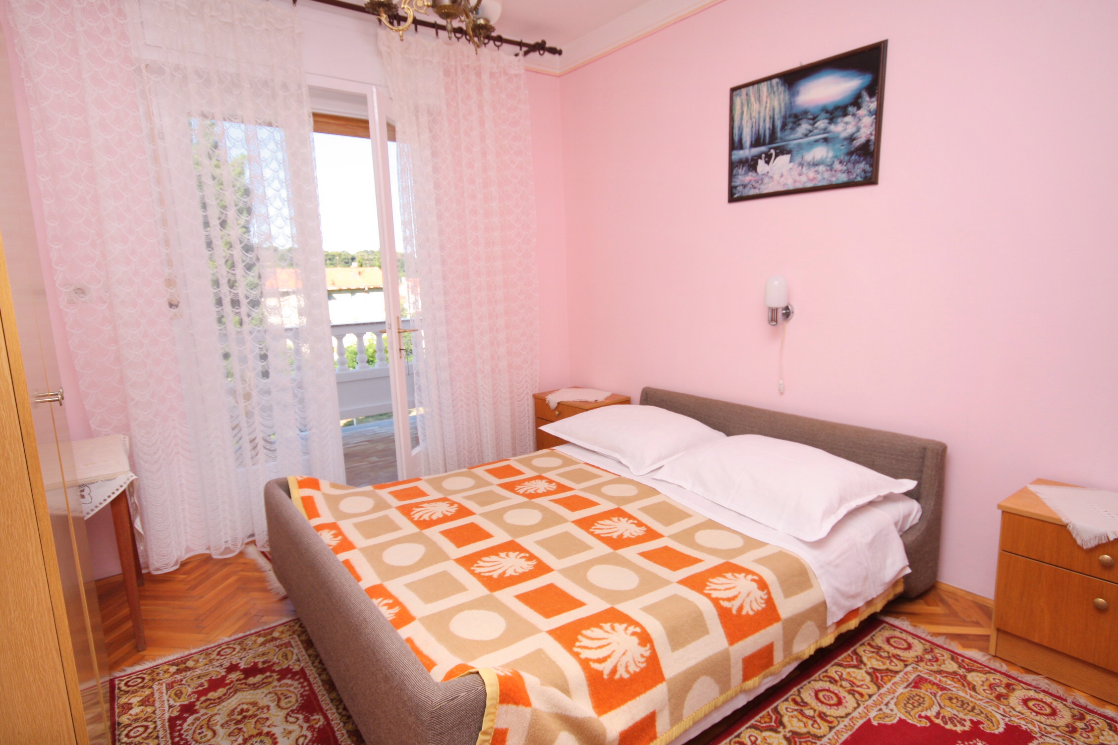Apartment can accommodate 4 guests. Beds are situated in 2 sleeping rooms, within 38m2. Guests can use a private terrace to enjoy the warm summer evenings. Food can be prepared using barbecue which is shared with other guests too. This accommodation unit welcomes pets at an additional charge. INCLUDED IN THE PRICE: tourist tax, final cleaning, parking, internet, laundry, iron, hairdryer, portable barbecue. OBLIGATORY ADDITIONAL COSTS: short stay fee (surcharge depending on a number of booked nights: 30% - 1, 20% - 2, 10% - 3). OPTIONAL ADDITIONAL COSTS: air-conditioning (€6.00 per night), pets (€5.00 per night). The availability of additional services for your chosen dates of stay, as well as their prices (if none are listed) must be checked ahead of time. Any additional services not shown in the price calculation are payable directly to the property owner and only if used by the visitor.