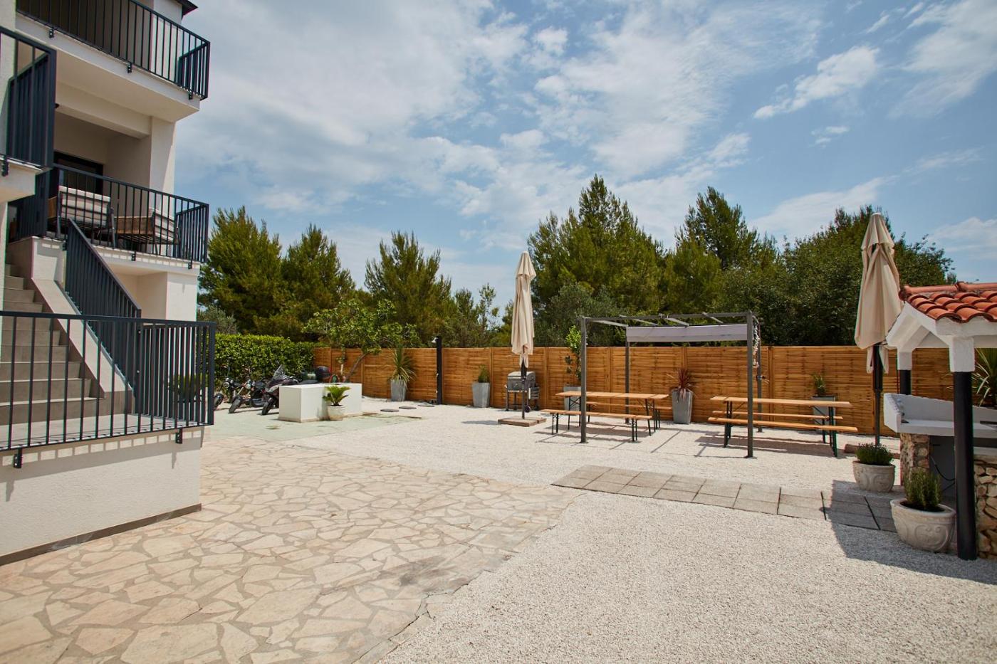 One-Bedroom Apartment. Boasting a private entrance, this air-conditioned apartment includes a kitchen, 1 bedroom and 1 bathroom with a walk-in shower and a bidet. Guests will find a stovetop, a refrigerator, a dishwasher and kitchenware in the well-fitted kitchen. The apartment also features a barbecue. Featuring a terrace with garden views, this apartment also offers a washing machine and a flat-screen TV with streaming services. The unit has 2 beds. ;