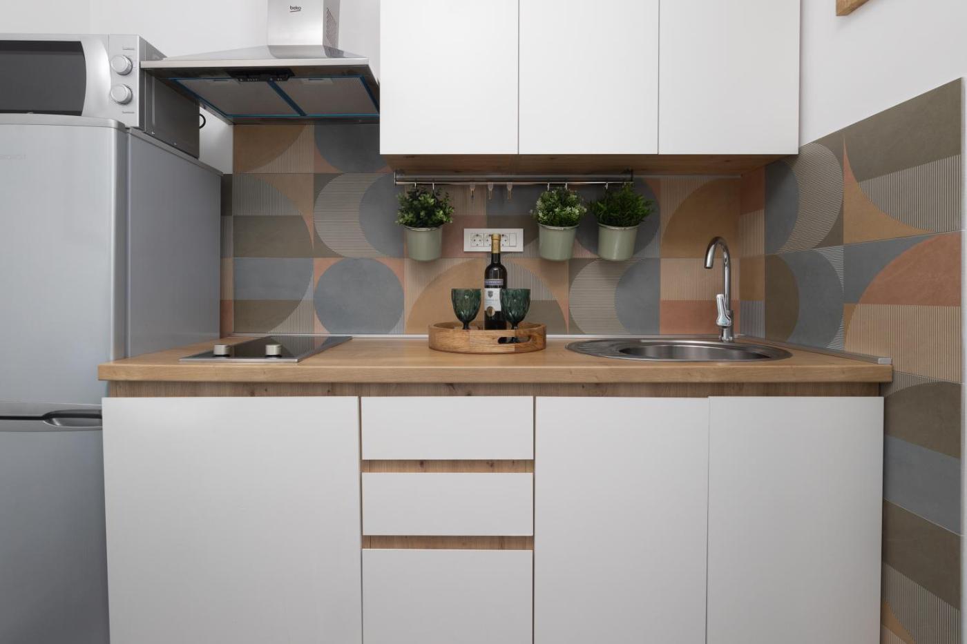 One-Bedroom Apartment. Featuring a private entrance, this air-conditioned apartment consists of 1 living room, 1 separate bedroom and 1 bathroom with a walk-in shower and a hairdryer. The well-equipped kitchenette has a stovetop, a refrigerator, kitchenware and a microwave. This apartment features a washing machine, flat-screen TV with cable channels, ancourtyard view, as well as winechampagne for guests. The unit offers 2 beds.