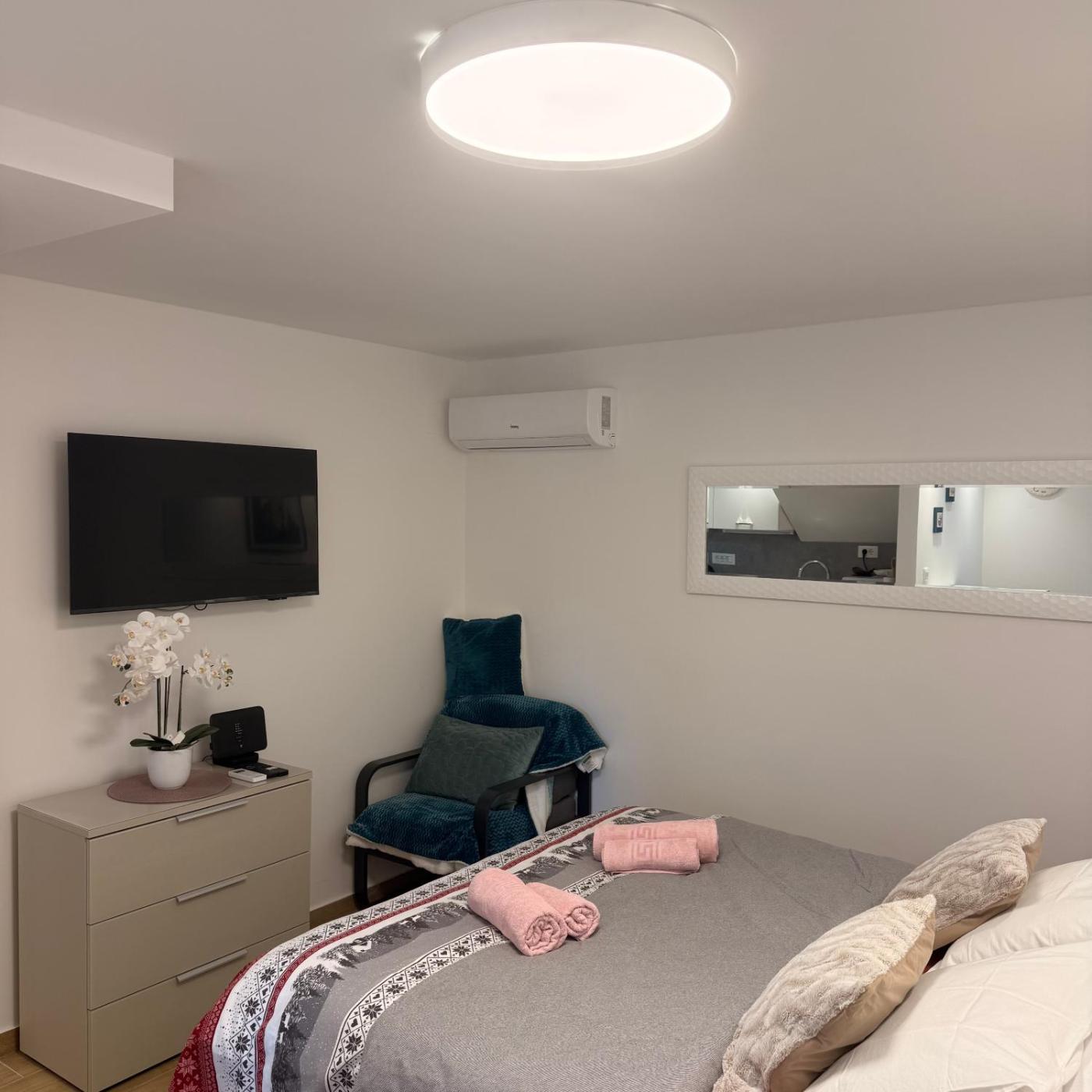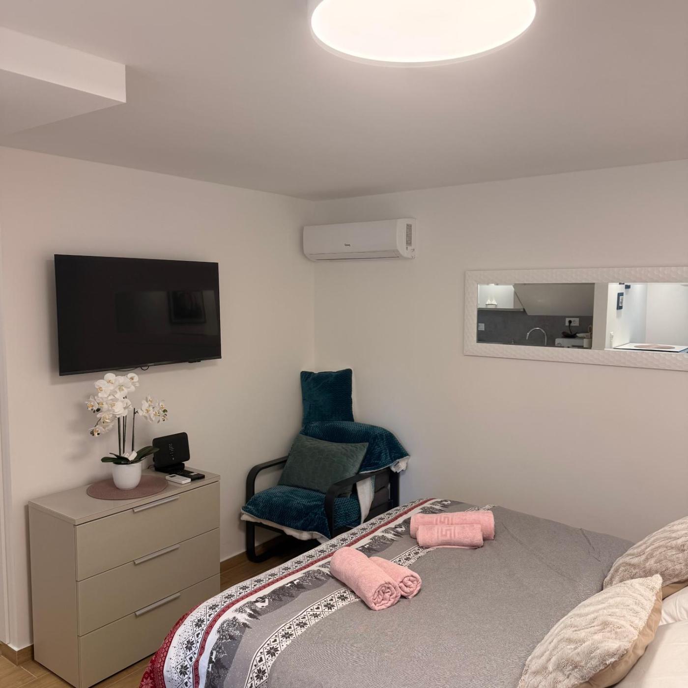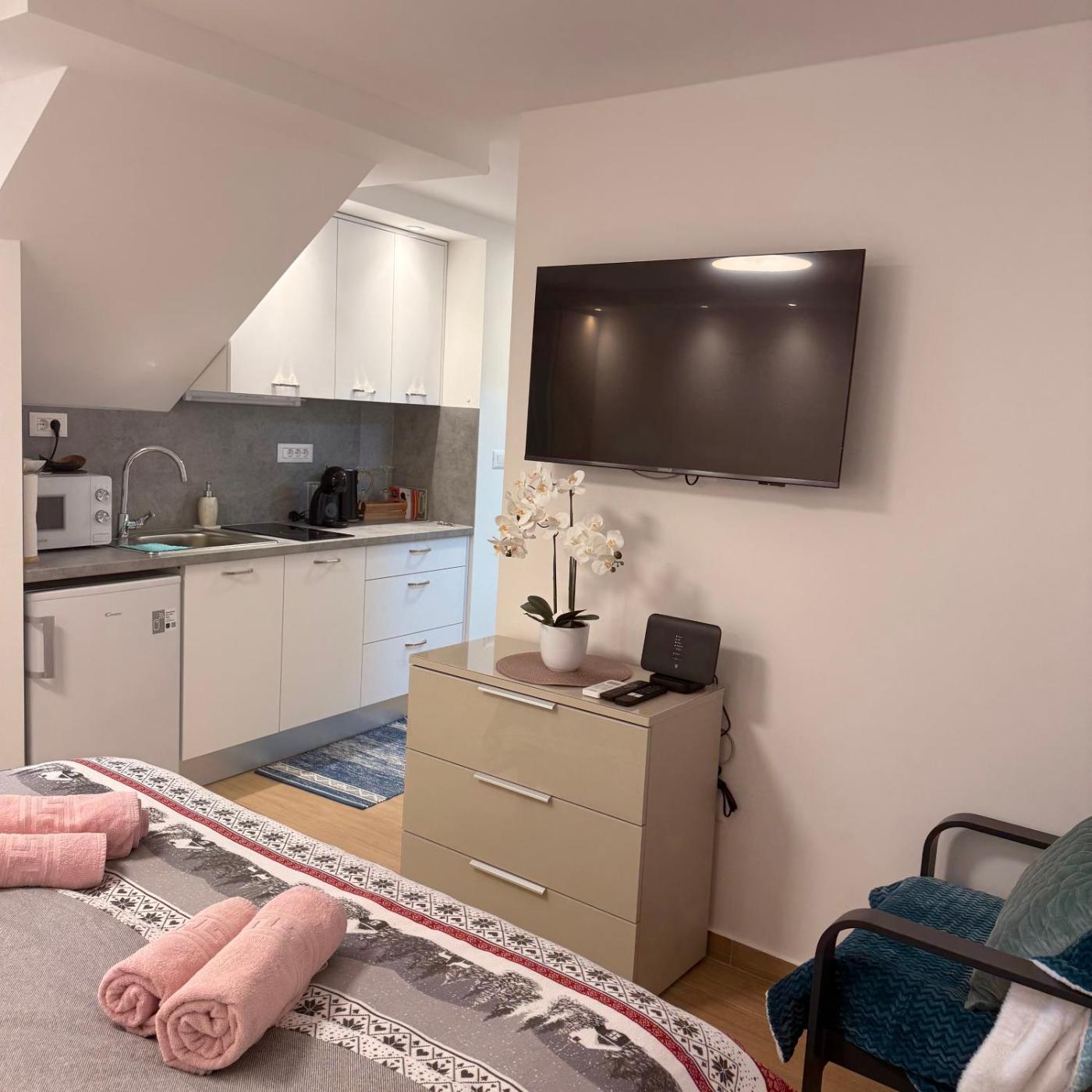 Studio Apartment with King Bed. The apartment features 1 bedroom and 1 bathroom with a shower and free toiletries. The apartments kitchenette is available for cooking and storing food. This apartment has air conditioning, soundproof walls, a flat-screen TV and ancourtyard view. The unit offers 1 bed.