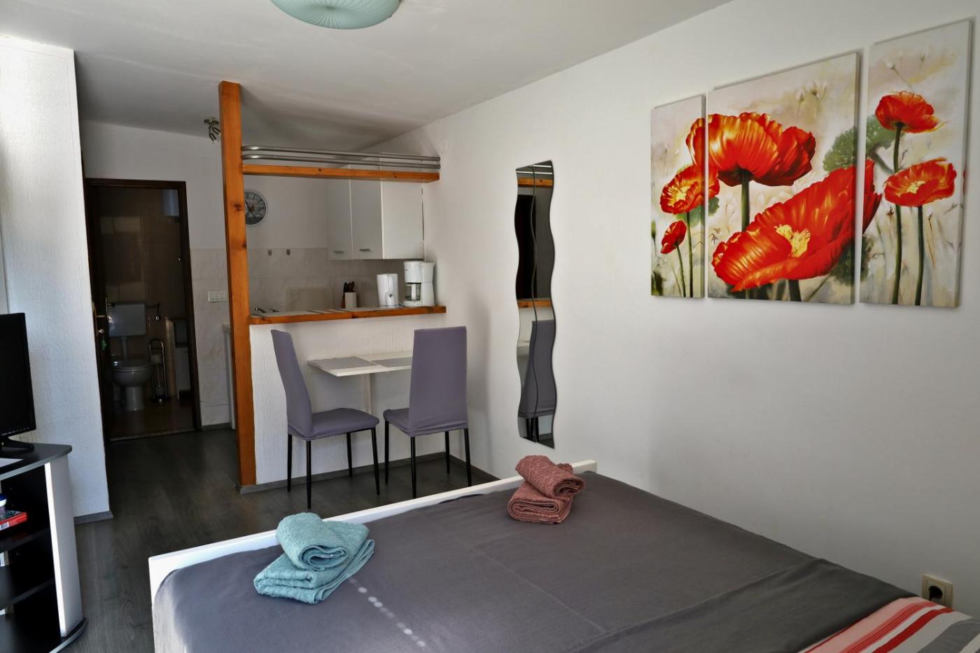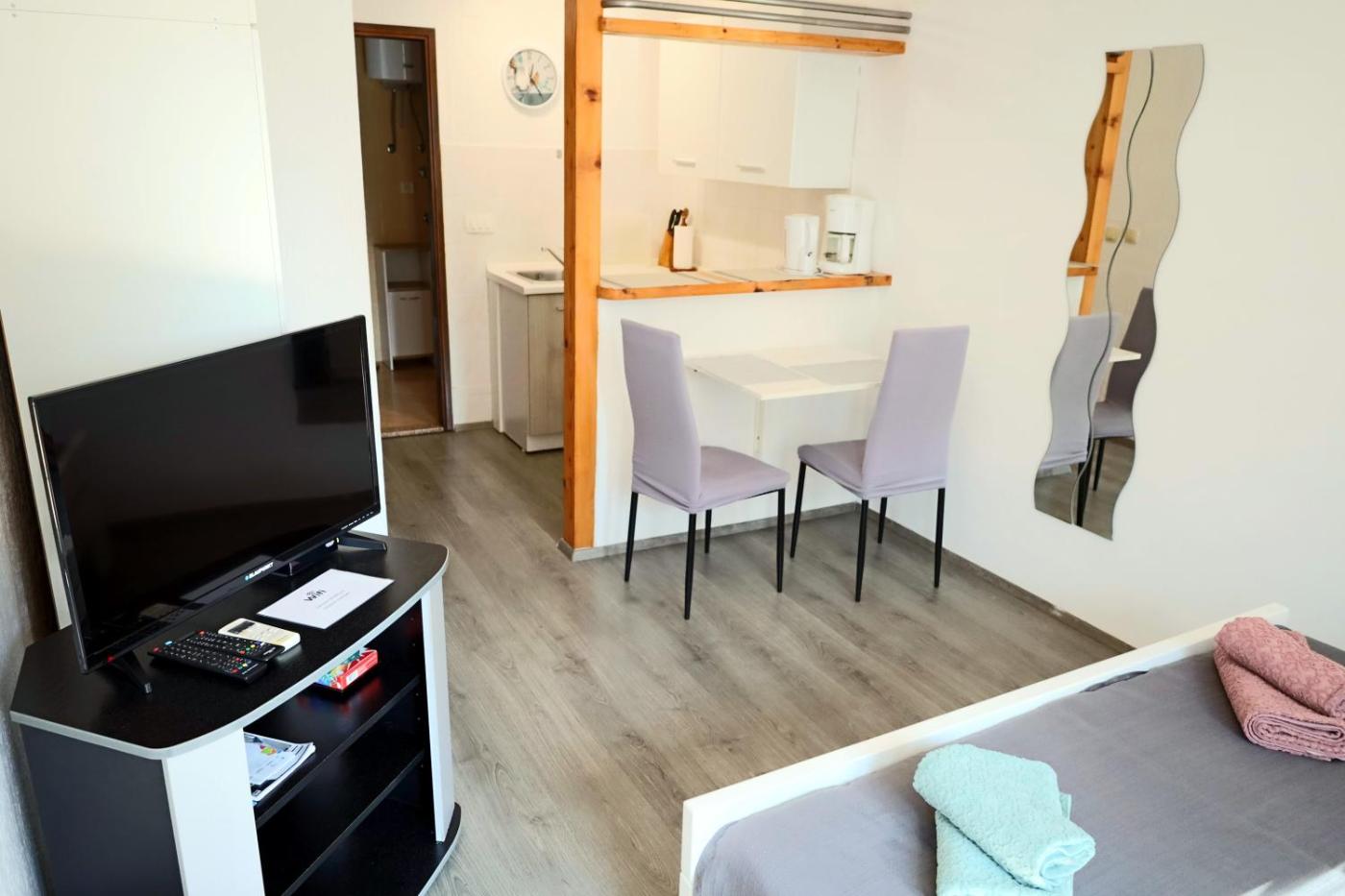 Studio Apartment. Featuring a private entrance, this air-conditioned apartment comprises 1 bedroom and 1 bathroom with a shower. In the kitchenette, guests will find a stovetop, a refrigerator and kitchenware. This apartment includes a dining area, a TV with satellite channels a tea and coffee maker and a terrace. The unit offers 1 bed.