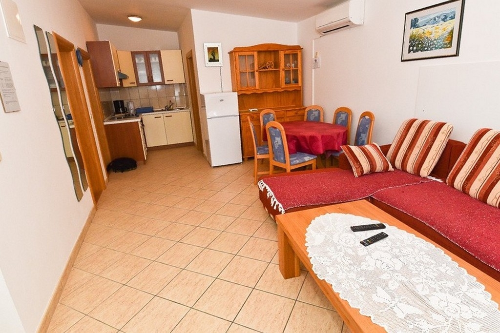 Apartment can accommodate 5 guests. Beds are situated in 2 sleeping rooms, but also in the living room, within 65m2. Guests can use a private terrace to enjoy the warm summer evenings. The apartment offers the sea view. Food can be prepared using barbecue which is shared with other guests too. INCLUDED IN THE PRICE: tourist tax, final cleaning, air-conditioning, parking, internet, baby cot, hairdryer, sunshade, sunchairs. OBLIGATORY ADDITIONAL COSTS: short stay fee (surcharge depending on a number of booked nights: 30% - 1, 20% - 2, 10% - 3). The availability of additional services for your chosen dates of stay, as well as their prices (if none are listed) must be checked ahead of time. Any additional services not shown in the price calculation are payable directly to the property owner and only if used by the visitor.