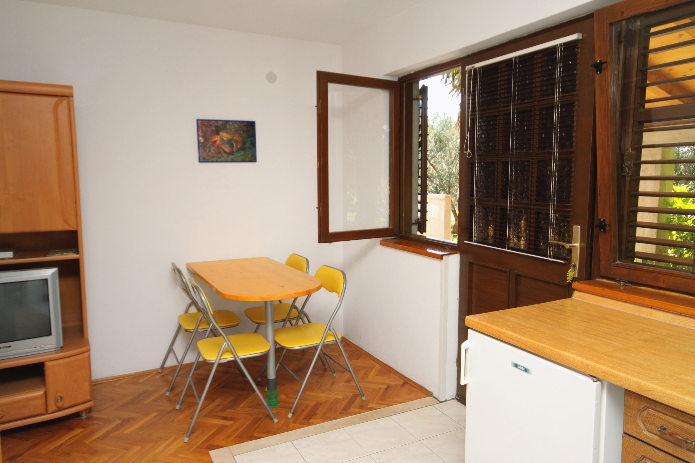 Apartment can accommodate 4 guests. Beds are situated in 1 sleeping rooms, but also in the living room, within 39m2. Guests can use a private terrace to enjoy the warm summer evenings. Food can be prepared using barbecue which is shared with other guests too. INCLUDED IN THE PRICE: tourist tax, final cleaning, air-conditioning, parking, internet, laundry, boat mooring, baby cot, iron, hairdryer. OPTIONAL ADDITIONAL COSTS: additional bed (€10.00 per night). The availability of additional services for your chosen dates of stay, as well as their prices (if none are listed) must be checked ahead of time. Any additional services not shown in the price calculation are payable directly to the property owner and only if used by the visitor. Discounts to the base price: free day 21=19 (for reservations of 21 or more days you get 2 free days for the stay until 31122026).
