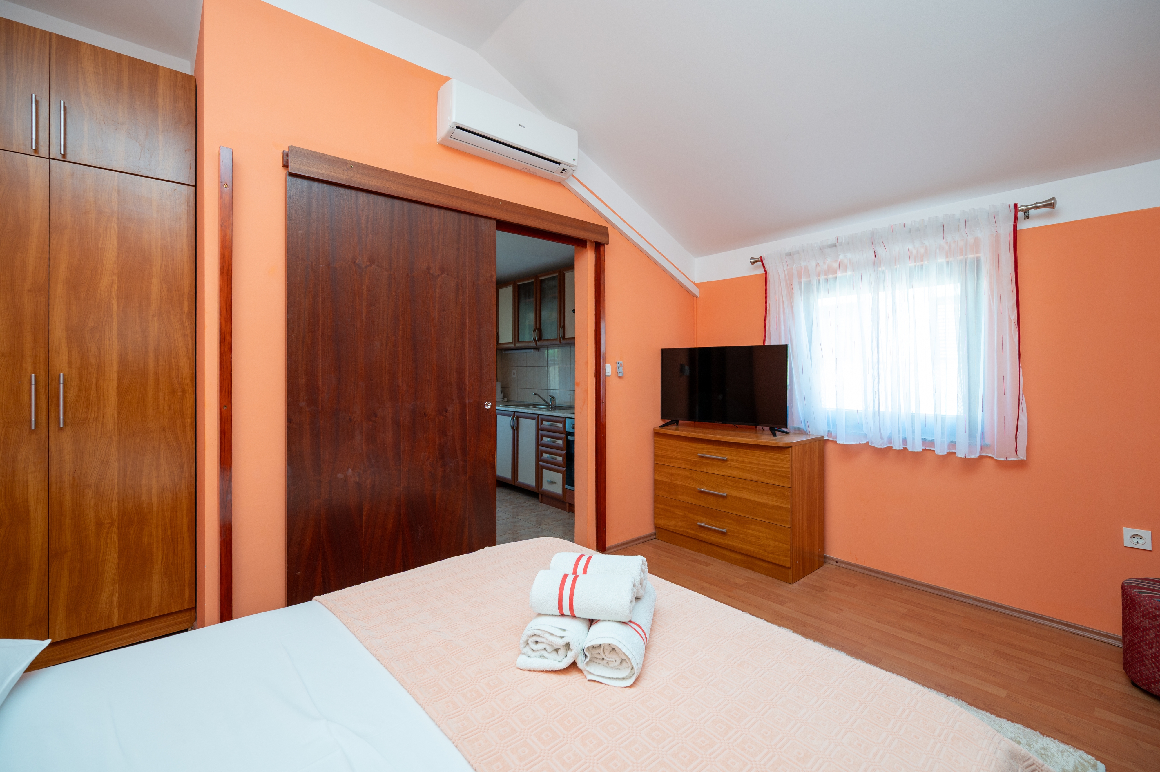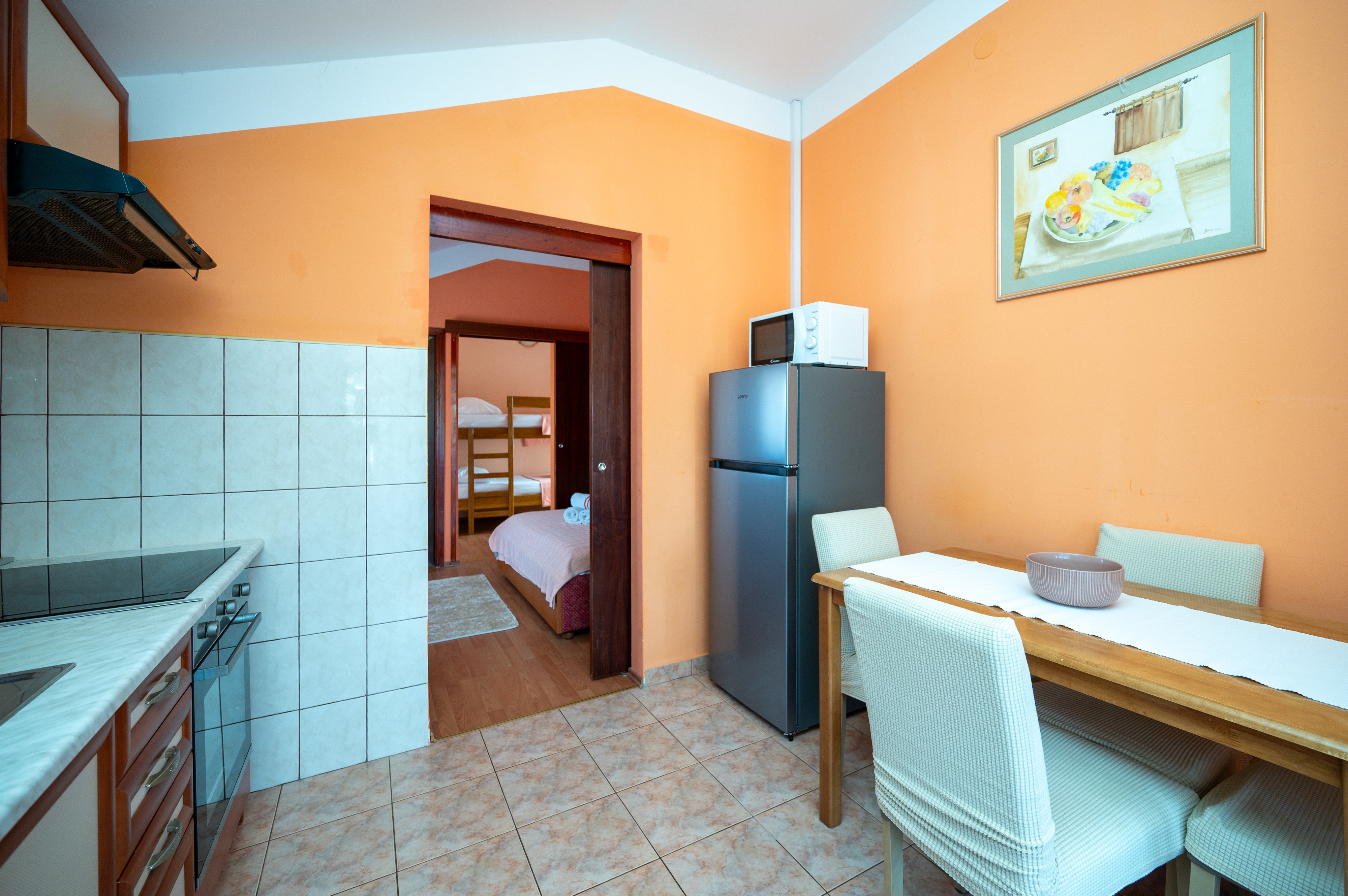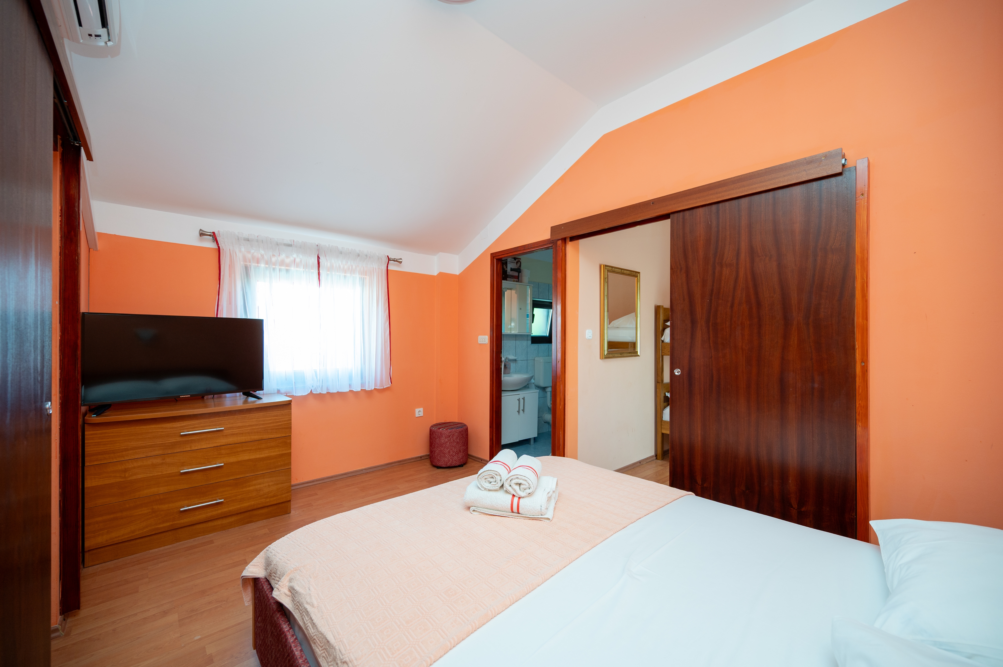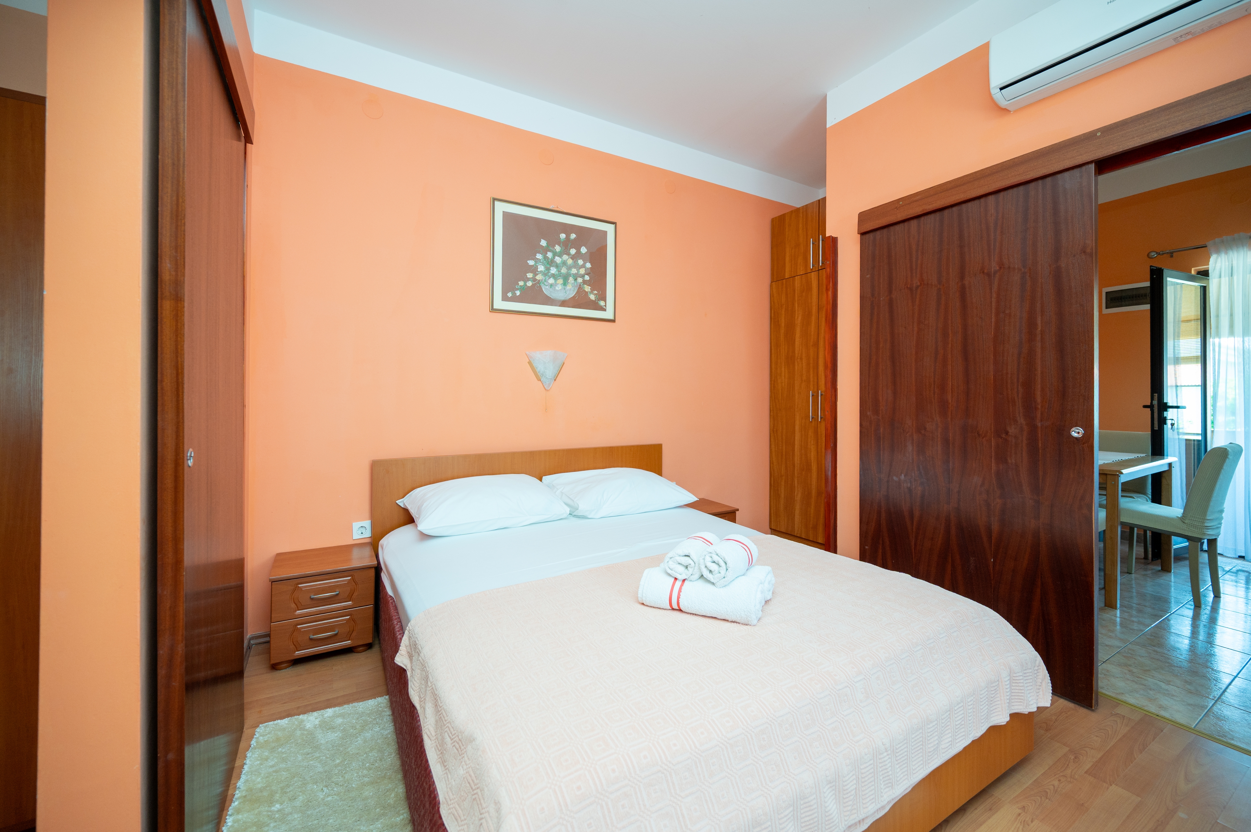 Apartment can accommodate 4 guests. Beds are situated in 2 sleeping rooms, within 27m2. Guests can use a private terrace to enjoy the warm summer evenings. Food can be prepared using barbecue which is shared with other guests too. INCLUDED IN THE PRICE: tourist tax, final cleaning, air-conditioning, parking, internet, laundry, baby cot, iron, hairdryer. The availability of additional services for your chosen dates of stay, as well as their prices (if none are listed) must be checked ahead of time. Any additional services not shown in the price calculation are payable directly to the property owner and only if used by the visitor.