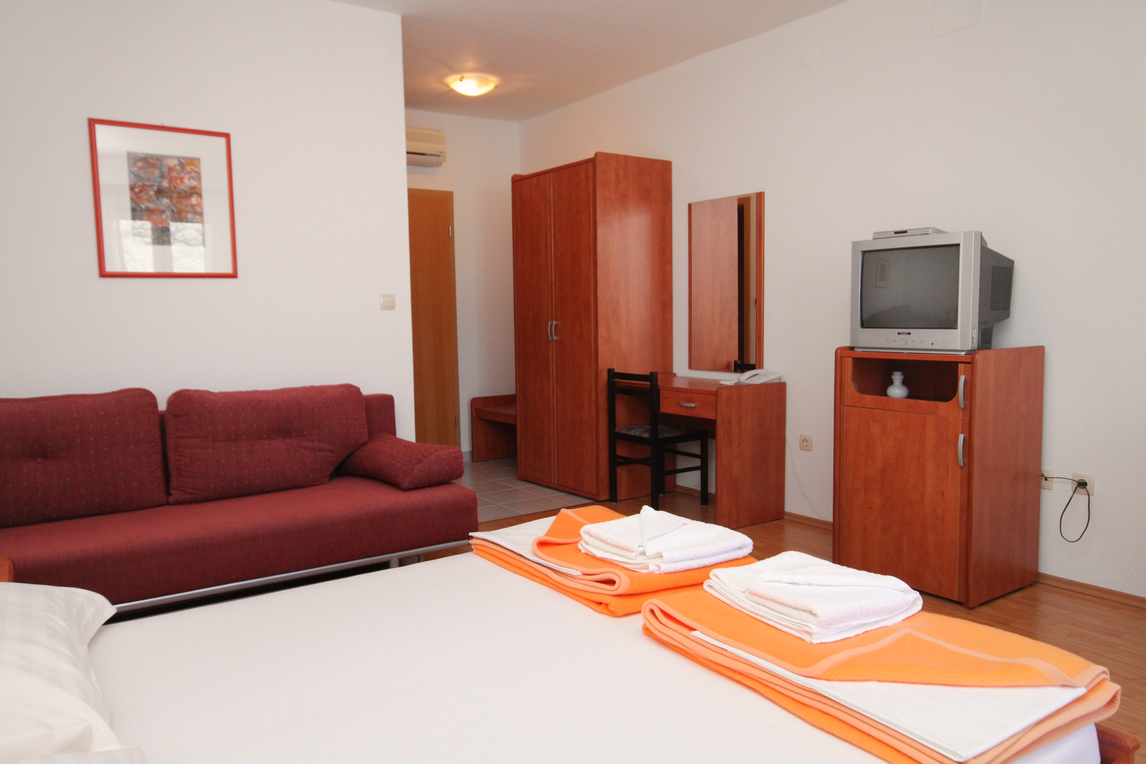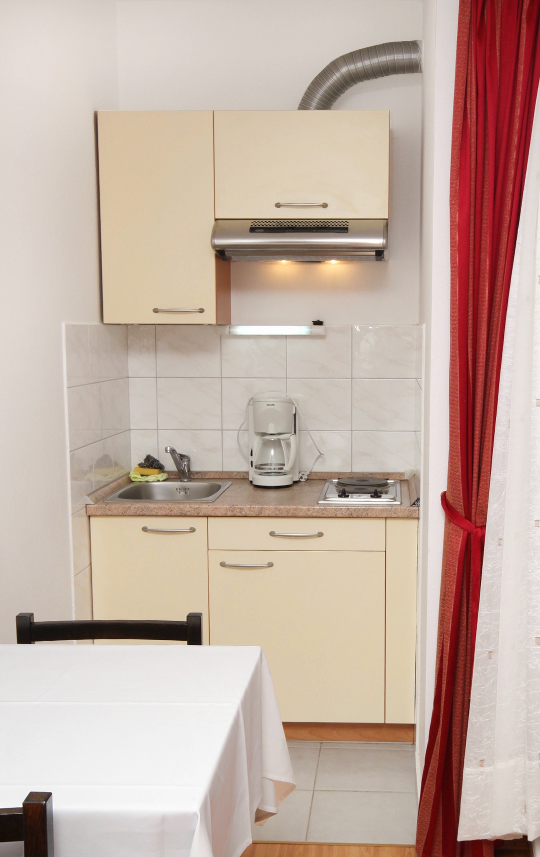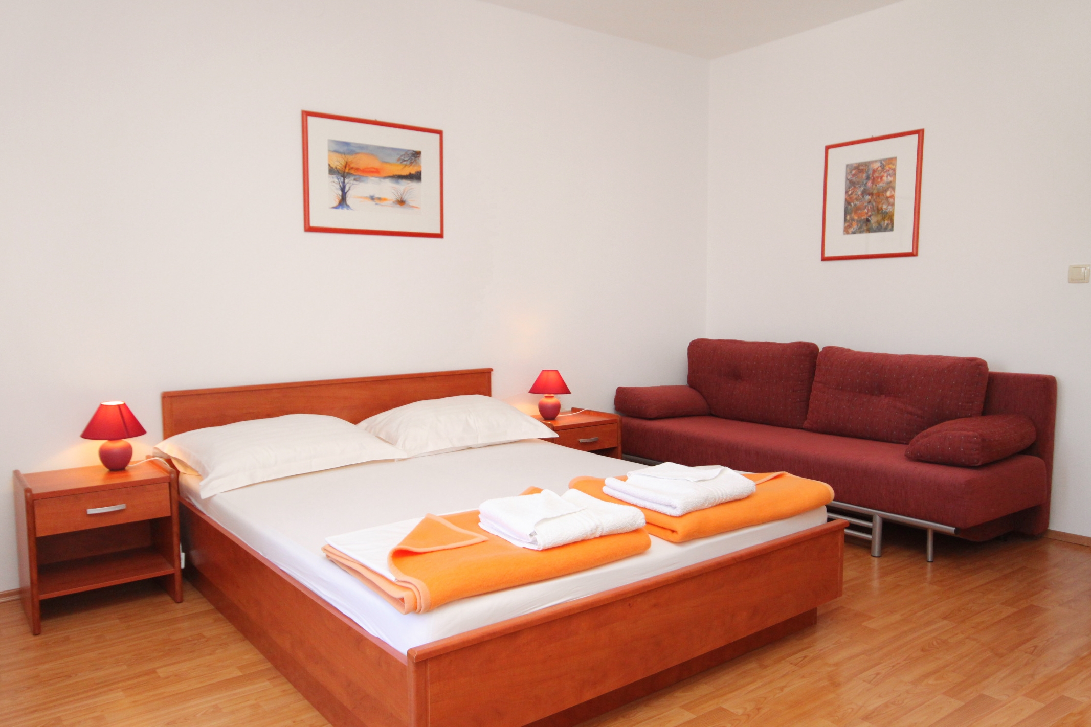 Studio flat can accommodate 3 guests. Beds are situated in 1 sleeping rooms, within 25m2. Guests can use a private terrace to enjoy the warm summer evenings. The studio offers the sea view. This accommodation unit welcomes pets at an additional charge. INCLUDED IN THE PRICE: final cleaning, air-conditioning, parking, internet, laundry, baby cot, iron, ironing board, hairdryer. OBLIGATORY ADDITIONAL COSTS: tourist tax (adults €0.93 - €1.50 nightperson, discount for children aged 12 - 17), short stay fee (surcharge depending on a number of booked nights: 30% - 1, 20% - 2, 10% - 3). OPTIONAL ADDITIONAL COSTS: breakfast (€13.00, a 50% discount for children aged 4 to 12 years, Children up to age 4 free of charge), half-board (€40.00, a 50% discount for children aged 4 to 12 years, Children up to age 4 free of charge), pets (€3.00 per night). The availability of additional services for your chosen dates of stay, as well as their prices (if none are listed) must be checked ahead of time. Any additional services not shown in the price calculation are payable directly to the property owner and only if used by the visitor.